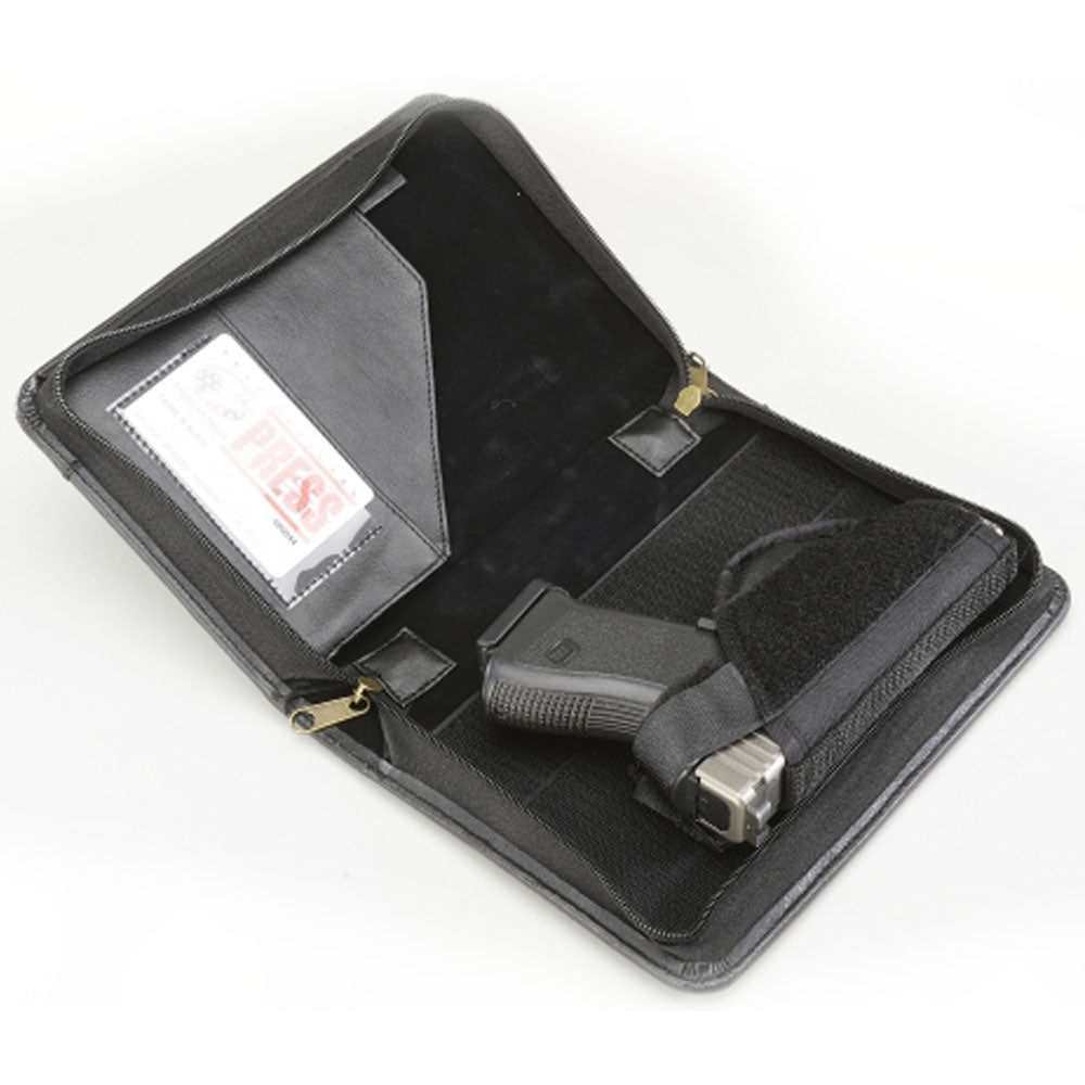 Dillon's Plan B Day Planner Holster holds a handgun, yet it fits in with business clothing and won't draw undue attention. It looks like a typical day planner, but inside there's a holster that's adaptable for either right-or left-handed draw. It fits most .380, 9mm, .40 and .45 caliber autos, including: Beretta, Colt, GLOCK, HK, Kahr, Kel-Tec, Ruger, Taurus, SIG, and Smith & Wesson. Will also hold small-frame revolvers with two-to-four-inch barrels.